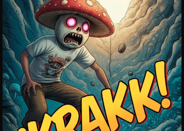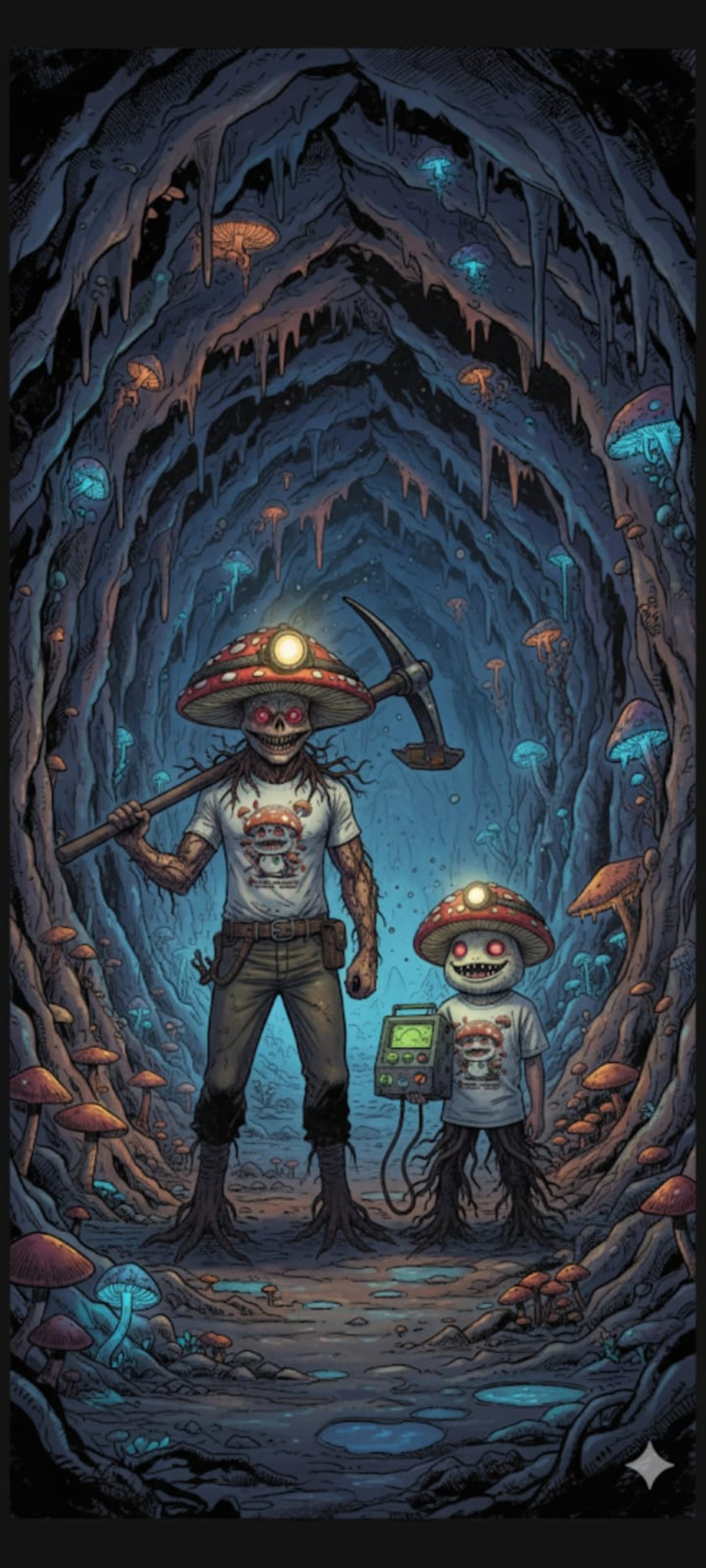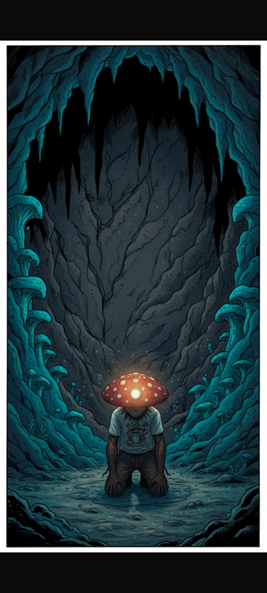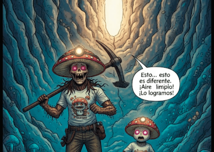 En el corazón de la mina oscura y silenciosa, el chico hongo se despertó con un sobresalto. Sus ojos se abrieron de par en par, y su cabeza de hongo se iluminó con un color más intenso, como una señal de alerta que resonaba en su mente.
