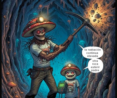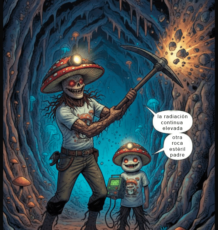 Juntos comenzaron a avanzar por la mina, siguiendo la señal del medidor. El chico hongo se sentía emocionado y nervioso, pero también un poco asustado. ¿Qué encontrarían en el agujero de gusano? ¿Sería peligroso? ¿Serían capaces de sobrevivir?