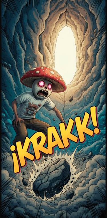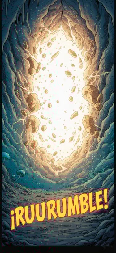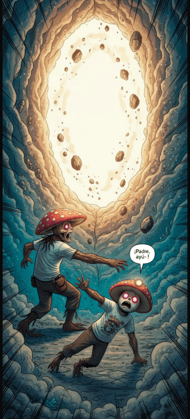 Pero el hijo hongo no lo escuchó. Estaba demasiado ocupado mirando el portal, su cabeza de hongo inclinada hacia atrás en asombro. No vio la roca que caía del techo, no vio el peligro que se acercaba. El padre hongo sí lo vio, y gritó con desesperación, "¡Hijo, cuidado!"