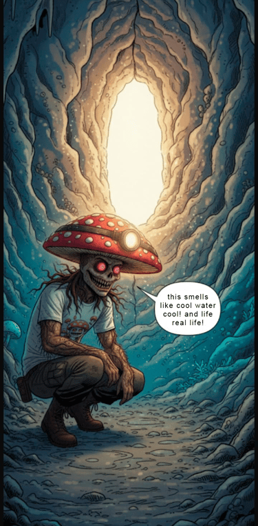 El padre hongo se movió con rapidez, su cuerpo grande y fuerte se desplazó por la mina con facilidad. Investigó el área circundante, buscando cualquier señal de peligro o de vida. De repente, el suelo comenzó a temblar y un portal se abrió en la pared de la mina, como una boca gigante que se abría para tragarse todo a su paso. El aire fresco y limpio salió del portal, y el padre hongo lo detectó de inmediato. Era una señal de vida, una señal de que había algo al otro lado.