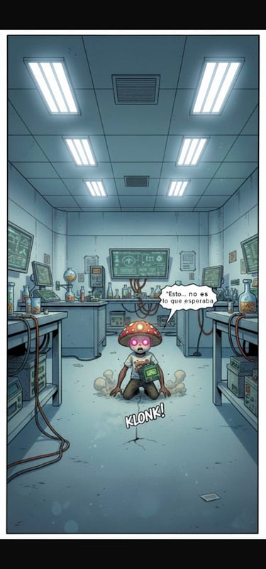 Mientras tanto, el hijo hongo cayó en un lugar desconocido, un laboratorio secreto en el planeta tierra. Se levantó con dificultad, su cabeza de hongo doliendo y su cuerpo cubierto de polvo. Miró a su alrededor, confundido y asustado
