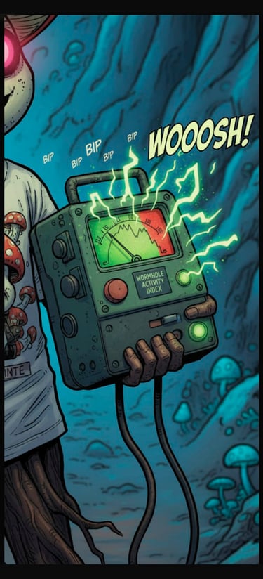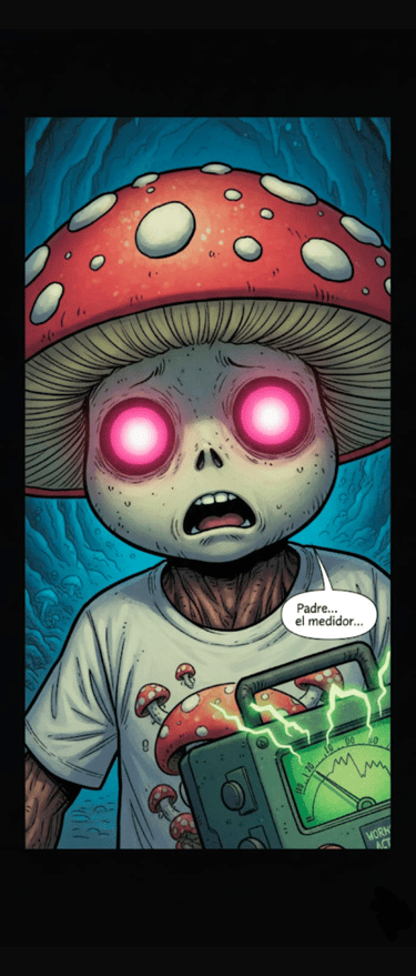 Pero el chico hongo no se dejó llevar por el miedo. Estaba decidido a encontrar el agujero de gusano, y nada lo iba a detener. Su medidor electrónico era su mejor amigo, y sabía que lo llevaría a la aventura de su vida.