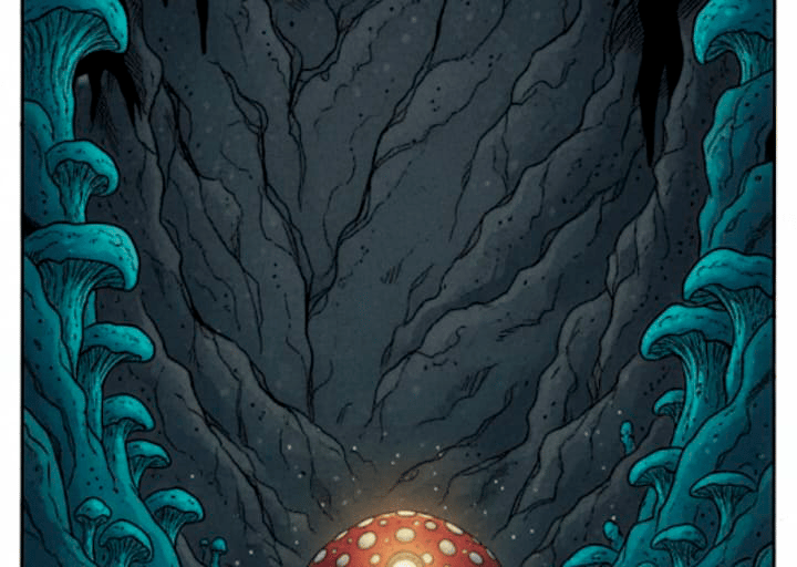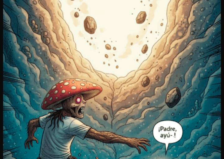Pero no hubo respuesta. El portal se cerró, y la mina quedó en silencio. El padre hongo se derrumbó al suelo, su cuerpo grande y fuerte ahora débil y vencido.