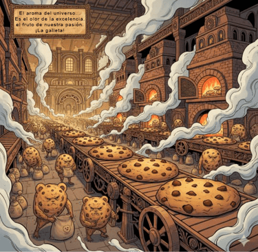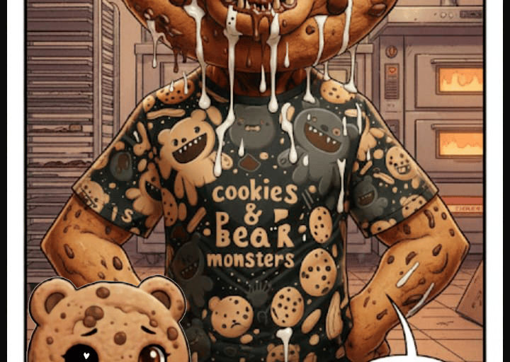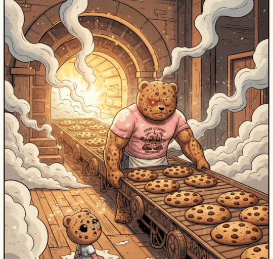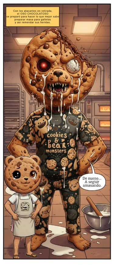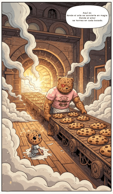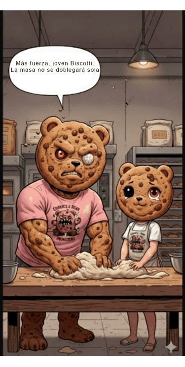 El aire en la cocina era espeso y dulce, cargado con la promesa de galletas recién horneadas. Crumble, el oso de galleta, amasaba con metódica furia, su ceño chocolatoso fruncido en la concentración. A su lado, Miga, su joven ayudante, golpeaba la masa con una energía desordenada, más parecida a una caricia que a una labor.