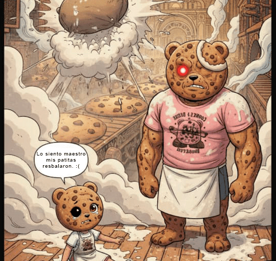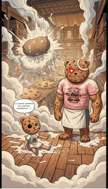 Miga, siempre dispuesta, corrió hacia el rincón. Pero la prisa es enemiga de la gracia. Sus pequeños pies de galleta se engancharon con el borde de una alfombra y el costal de harina salió disparado por los aires. El impacto fue seco y crujiente. El oso galletoso apenas tuvo tiempo de girar: la esquina del costal chocó contra su cabeza.