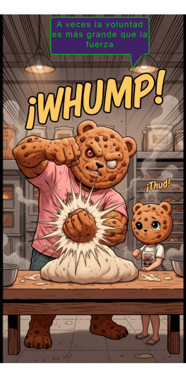 ¨¡Más fuerte, Miga! ¡Siente la masa! No estás dando palmaditas a un gatito, ¡estás forjando un imperio de dulzura!¨, gruñó Crumble, demostrando con un golpe firme. Su voz era áspera, pero sus movimientos eran los de un artesano. Miga lo intentó, apretó los labios con esfuerzo, pero su pequeña fuerza apenas conseguía un leve pliegue en la elástica masa. A veces, la voluntad es más grande que la fuerza, y Miga lo sabía bien.