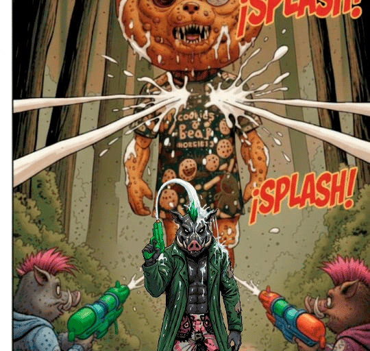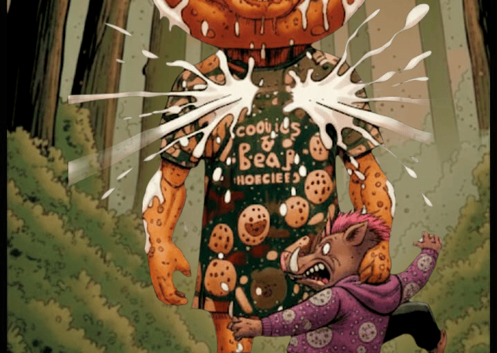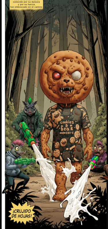 Las pistolas de los jabalíes escupieron un chorro de leche fría y blanca. La leche es el némesis de los Galleta Osos Chocolatosos: ablanda su corteza y amenaza con convertirlos en un desastre empapado. Sin embargo, en Crumble, el efecto era diferente: el contacto con el líquido lo hacía crecer, infundiéndole un poder temporal que transformaba la fragilidad en una fuerza descomunal.