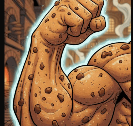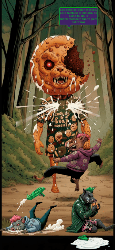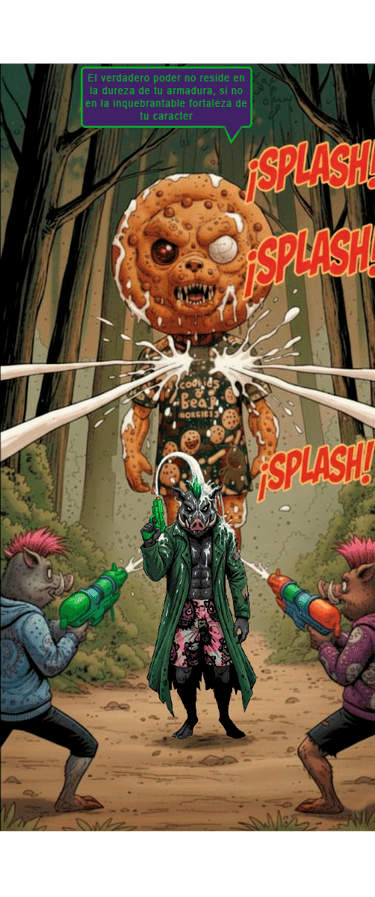 Los jabalíes dispararon ráfagas, la leche empapaba el cuerpo de Crumble, pero él se mantenía firme, un coloso de cacao cada vez más grande. El verdadero poder no reside en la dureza de tu armadura, sino en la inquebrantable fortaleza de tu carácter.